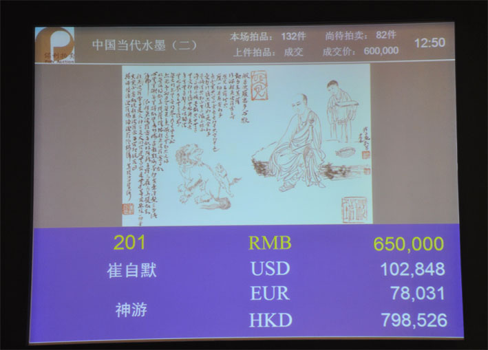 2012年6月2日上午,在北京保利春季拍卖会上,著名画家崔自默博士国画精品《神游》,水墨绢本,尺寸17cm×26cm,约0.4平方尺,画面全文题写《心经》,经过多轮竞拍,最终以74.75万元人民币成交。