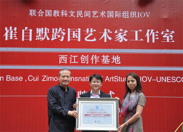 联合国教科文民间艺术国际组织IOV全球副主席、中国区主席陈平女士(右)与著名艺术家崔自默博士(左)向贵州天下西江旅游文化开发有限公司董事长吴迪先生(中)授予“崔自默跨国艺术家工作室”西江创作基地证书