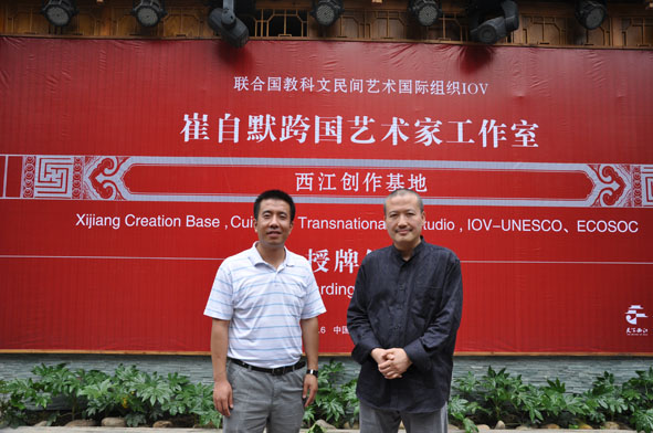 中国书画协会主席崔自默博士作为中国当代知名的艺术家,在今年3月27日荣获联合国教科文民间艺术组织IOV颁发的"文化艺术特别成就奖",是世界范围内首位获得这一奖项的艺术家,同时也获得"IOV中国形象大使"的荣誉称号。6月3日,崔先生与IOV全球副主席、中国区主席陈平女士在北京共同发起并成立了"崔自默跨国艺术家工作室",近日,即赶到黔东南苗族侗族自治州雷山县西江千户苗寨成立了该工作室的第一个创作基地。