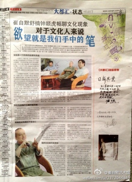 “人活着就不能歇着,人活着是有欲望的。”当被主持人问及新书《默语·默画》出版、成集的机缘时,崔自默先生如此回答。这本书将文字和画作组合在一起,记录了崔博士对文化的思考,对艺术的思考,同时也展现了他的艺术作品。“这种组合式的书是一种新的尝试。”崔博士说:“能够把国学、艺术上的一些东西随性地表达出来,让大众、年轻人群体能够轻松地吸收到艺术的营养,是我这本书的精髓所在。”在他看来,“欲望是文人之笔。我每天都会有一些不一样的感想,在这基础上,我就希望能够把有意思的事情写出来、画下来,让更多的人看到。日复一日,越来越多的人看到了我的作品,我身上就有了一定的社会责任,想要写更多有用的东西。这不仅是对自己良知的一种慰藉,对看到的人也会起到启迪和教育的作用。”身为音乐人的舒楠,他通过对音乐、电影的例子来讲述文化的内涵。他表示,希望中国能够多出像崔自默先生这样的大人物,也希望我们新一代的大儒能够有这种风范,把自己所了解的中国文化通过简单的桥梁传播给更多人。钟社长对此非常认可,他说:“文化作为近几年发展的重点,一定是有作用的,文化是一个民族的血液和灵魂。文化也是解决所有人思想问题的根本途径”。既然是文化论坛,自然少不了对文化的讨论与思考。谈及近几年备受关注的文化保护和传承问题,三位文人各抒己见。崔自默提出了一种新颖的传承保护观念“南墙北调”,将南方的建筑移植到北方,原本普通的也变得稀奇,将过去的移植到现在,平常的也变得珍贵,这是一种跨时间跨空间的文化对话,也是一种文化的传播。因为,传统文化是博大精深的。但是当传承到年轻人、儿童时,一味的死记硬背是完全无用的。保护传统文化,应该保护有用的、对当代文明有意义的、培养真正现代文明的文化。钟社长则从另一个角度切入,他表示,“文化大发展大繁荣是近几年的重点。文化是有作用的,是民族的血液和灵魂,是解决所有人思想问题的途径,文化的层次、深入的程度已经超越我们思想的境界。现在的年轻人有几大缺点:抱怨,希望别人做什么,对自身的思考欠佳。发展中国大文化、实现中国梦,我们每个人都不能也不该闲着。”纸媒是成熟期还不会消亡。其实在文化大发展的今天,作为纸媒我们也应该起到排头兵的作用,但在新媒体的狂轰乱炸下,纸媒江河日下的说法年年都有。对此,音乐人舒楠表示自己虽不是这方面的专家,也觉得纸媒的发展前景不容乐观。崔自默赞成他的观点,虽然纸是写书画画最基本的媒介,也是可触摸的传统记忆的载体,但对于纸媒发展前景,他表示忧虑重重,因为当下年轻人的眼球多被新媒体所吸引。“所以说,纸媒更应该考虑自己的竞争优势在哪里,从而寻求新的发展。”崔博士说。不过对于两位大艺术家的忧虑,整天与纸媒打交道的钟社长却有着不同的想法,在他眼中,当今的纸媒并不是在衰退期,而是在发展的成熟期,而偶尔的挫折是发展过程中的常态。至于如何实现纸媒与艺术家间的互动,钟社长用了三个词来概括:“用脑,用心,用力”。
