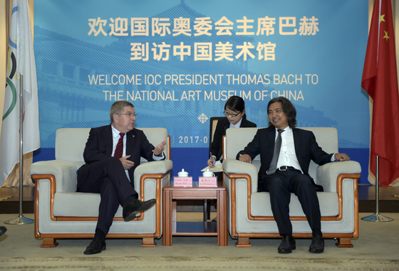 2017年8月27日上午,国际奥委会主席托马斯·巴赫一行专程来访中国美术馆,与中国美术馆馆长吴为山亲切会面。国际奥委会主席托马斯·巴赫,国际奥委会副主席于再清,国际奥委会委员李玲蔚、委员杨扬、名誉委员霍震霆,中国美术馆馆长吴为山,中国美术馆党委书记张士军,中国美术馆副馆长安远远、副馆长张晴等嘉宾与新闻媒体共同出席了本次活动。活动由安远远副馆长主持。