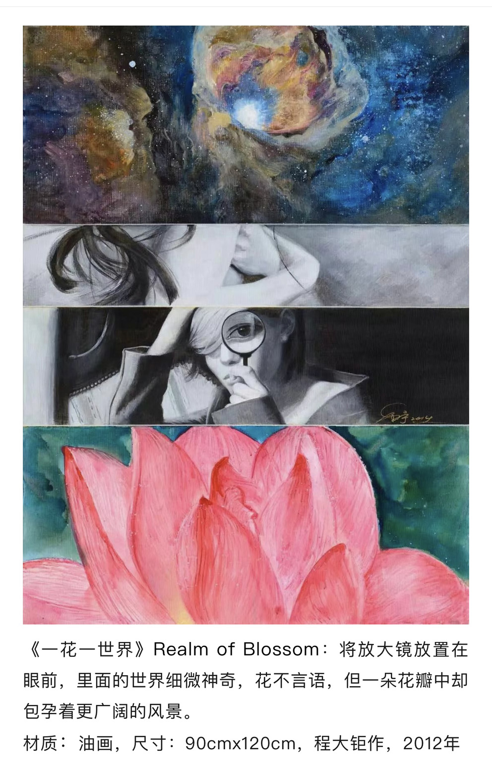 程大钜,曾毕业于南京航空航天大学美术学院戏剧影视美术设计专业获本科学士学位。中央美术学院研究生课程班研修壁画、公共艺术、油画等专业。后就读于北京师范大学美术学油画专业获研究生硕士学位,后又于研学于文化部中国艺术研究院,导师崔自默先生,学习中国当代艺术,从事“思维画派”系列创作,并加入联合国教科文国际组织崔自默跨国艺术工作室,负责开展国际间文化交流,创作展览等工作。
