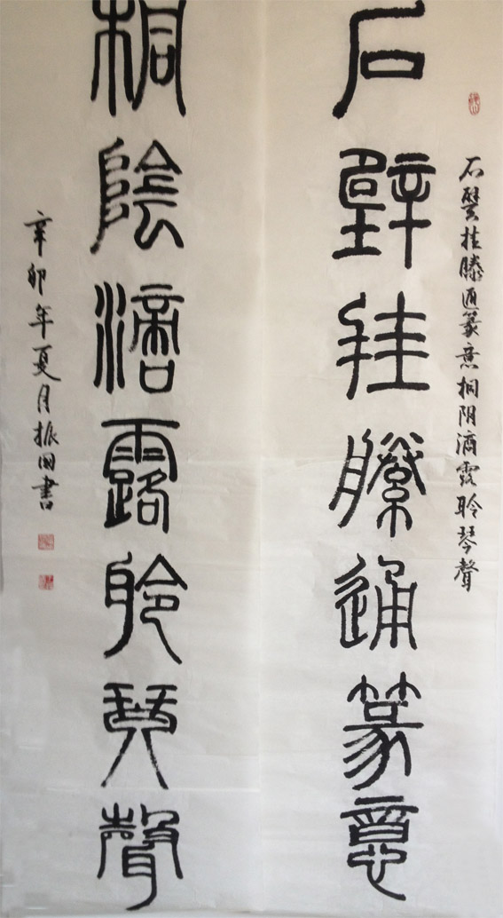 王振国,男,1955年出生,山东省济南人,现任中国书画协会终身理事、中国新商务书画研究院院士、中国楹联艺术家协会会员、山东省楹联艺术家协会会员、中国神舟画院研究员、山东省羲之书画院协会会员、东营市胜利油田协会会员,王振国先生,他把古人的用笔、结字、章法等艺术特点熟记于心,运用自如,从而形成了他博大沉雄、气势恢宏、独树一帜的艺术特色。他的作品既有古人的神韵和笔意,更有他自己的风貌,笔墨精巧、特色鲜明、魅力无穷、雅俗共赏,欣赏后能使人产生一种美的愉悦和高雅舒适的享受。 师从王雪勤,王運昆老师,自幼习书,上溯秦篆、魏碑和汉隶,及至颜、柳、欧阳、赵、,遍临诸家名帖名碑,钟情二王以求其本;酷爱金农以求其奇;多临魏碑,以求其基;继习篆隶,以朔基源;间窥行草,以道其行,苦学善用,用功甚勤。作品多次被公安部,山东省公安厅入选展出。2010年展出的作品被省公安厅收藏;2005年被中国电影百年评为二等奖;2006年书法作品《圣丹青墨韵黄河口》,全国诗书画大赛评审委员会评定入选作品。 书道虽简单,却是吃苦勤,此道无捷径,数年用苦功。作品多次受到广大收藏家的赞评,多幅上乘佳作被国内外,华人华侨,等收藏家收藏。