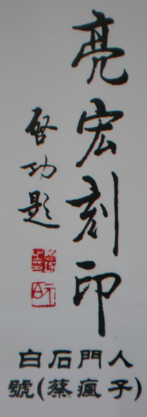 蔡亮宏,男,生于1962年,湖南岳阳人.篆刻教授,中国书法家协会会员 少儿时期,在国画大师齐白石嫡传弟子长沙人李立先生门下学艺,耳濡目染,刻苦钻习,加上天资聪慧,悟性过人,很快就在书画艺术上崭露头角.成年后,专事参悟篆刻书画之奥妙,探寻天人合一之佳境,兼收并蓄,转益多师,艺术有大成,尤其以篆刻治印最为见长。其作品布局奇巧,刀法传神,精练酣畅,拙朴灵秀,方寸之间,奇思妙想,浑然天成。曾参与岳阳楼等名胜园林的雕塑、篆刻及书画等艺术工程,作品深得艺术界及社会广泛称。 1987年移居鹏城深圳,尽汲南国灵气,深得岭南艺术精要,其篆刻、微雕技艺更上一层楼;其反书艺术,自成境界。由于其艺术风格卓然独立,在业界得雅称“疯子”并广为人知,名声远扬。1990年成立蔡亮宏艺术工作室,金石书画大家李立先生亲题“风子草堂”匾额。其篆刻和书画作品曾捐赠北京亚运会,获亚运组委会分颁发的纪念奖及荣誉证书。1995年其篆刻作品在深圳被作为国礼赠送给叶利钦总统。1998年,他的玛瑙微雕在北京展出,并获人民大会堂颁发收藏证书。曾先后为党和国家领导人邓小平、江泽民、胡锦涛、李鹏及国家工商总局、全国残联等机构领导治印,在深圳仙湖揽胜亭、梧桐山等风景区均有刻石题匾;曾获国际篆刻比赛银杯奖,其作品在日本、加拿大、美国等均有收藏。媒体对其艺术均有报道,其艺术成就被收入《湖南紫荆花集》、《广东省名人录.艺术篇》等典籍。