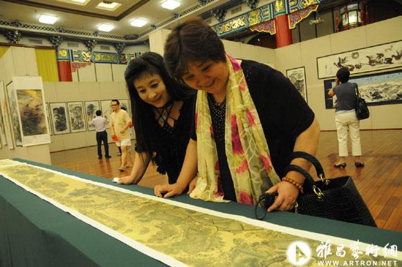 展览现场,中国美术艺术家协会会员、中国书画家协会理事、一级美术师杜彩霞摹制的《清明上河图》吸引了不少参观者的眼球。据悉,此画花费了作者长达1年的时间,最难得的部分是船的绳套表现得淋漓尽致。杜彩霞介绍说,整幅作品长528.7厘米、高24.8厘米,按1:1比例保持原作的神韵,由于线条细,画起来特别费力。