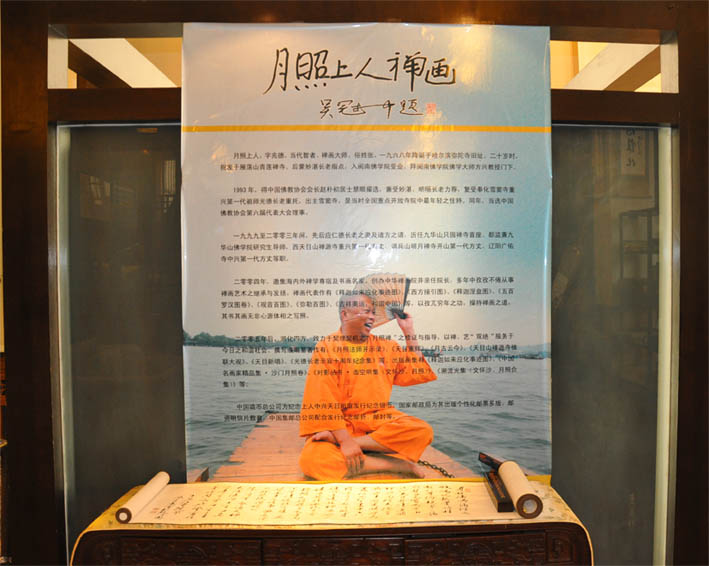月照上人,当代杰出的禅画艺术传承与光大者、大禅师。屡承恩师——已故中国佛教协会会长赵朴初先生惠注勖勉,秉朴老慈命,邀集海内外禅林艺苑名宿成立中华禅画院,并亲任院长。以孜兀穷年之功,操持禅画之道,其书其画无非心源体相之写照。 上人先后出主两浙名蓝(奉化雪窦寺、天目山禅源寺)、辽北二寺(调兵山明月禅寺、辽阳广佑寺)丈席,曾任九华山全山唯一十方丛林——祇园禅寺首座兼九华山佛学院研究生导师。在在处处宏开函丈,随宜说法,若讲经开示,若论坛演说,若会议展览,若义卖拍卖,若网络弘法……种种事业运作,起全机大用,度有缘众生,堪称佛教事业现代化之先驱。近几年来,上人一身自在,游化四方,致力于契理契机之“月照禅”之修证与指导,在众生心田拓荒耕耘,以淑世淑人为本分,以书画、演说、撰著为作务,敷法座于檀越熏修之精室,展经筵于EMBA专班,道俗景从,遐迩来叩。 禅画代表作有《释迦如来应化事迹图》、《西方接引图》、《释迦涅槃图》、《五百罗汉图卷》、《吉祥奥运•和谐中国》、《十八声闻游戏神通渡海图》、《五百大阿罗汉图卷》、《朝元仙仗图》、《法华经变图》、《玄门雷部众神尊像》等,精品靓构屡创拍卖佳绩。编撰著作有《月照法师开示录》、《天目重辉》、《月古云今》、《天目山禅源寺楹联大观》、《天目新唱》、《兆德月照上人如意歌》、《月照上人开示录》等。出版图(画)集《释迦如来应化事迹图》、《中国名画家精品集•沙门月照卷》、《溯流光集》(文怀沙、月照合集)、《昊月青华》(月照上人青华艺术图录)、《月照和尚写经集》、《弥勒佛像画集》、《道家神仙像画集》、《观音菩萨画集》、《罗汉像画集》、《儒释道线描人物画集》、《月照上人禅画》、《月照上人禅画艺术系列丛书》(3函24册)、《月照上人禅画精选》、《茶之父》(月照上人紫砂艺术大观)、《月照禅丛刊》(18册)、《中国近现代名家画集•沙门月照》等。