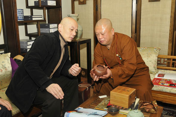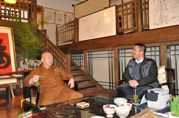 中国书画协会秘书长韩健与月照大师在展会现场