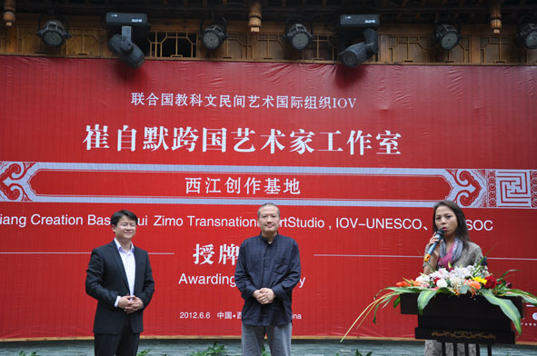 联合国教科文民间艺术国际组织IOV全球副主席、中国区主席陈平女士(右)与著名艺术家崔自默博士(左)向贵州天下西江旅游文化开发有限公司董事长吴迪先生(中)授予“崔自默跨国艺术家工作室”西江创作基地证书