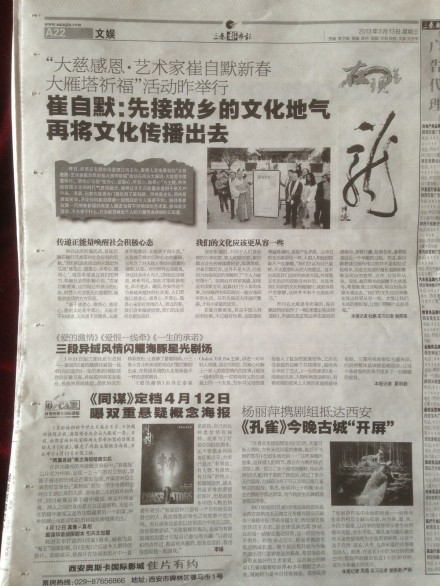 2012年3月12日,"新文化之旅"。“大慈感恩·艺术家崔自默新春大雁塔祈福”活动在西安大雁塔·大慈恩寺隆重举行。活动以弘扬“慈悲心、感恩心、平常心、敬畏心”为主题,将传统祈福文化和时代气息相融合,倡导让文化正能量渗透到千家万户中去。清晨,记者在慈恩寺门前见到了崔自默。同样是光头,同样是满面笑容,不论何时崔自默都一如既往的令人倍感平和。陪伴着崔自默一同前来祈福的有家人朋友也有不同领域的艺术家,参加此次活动,不为求个什么,只为能贡献出个人的力量传递活动的正能量。