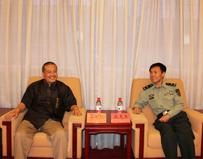 国防大学政治部段天杰少将在贵宾室欢迎崔自默博士到国防大学讲座