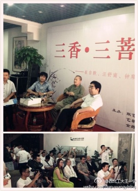 灿烂的阳光挤走飘落的雨水,书院门的青砖小巷上又多了熙熙攘攘的人潮。行至巷尾的崔自默艺术馆,突然发现以往安静的馆内此刻热闹了许多。原来昨天是崔自默先生新书《默语·默画》的发布仪式,陕西日报传媒集团党委委员、总经理、陕西日报社社长钟顺虎,国学大师、著名书画家崔自默博士,著名音乐人舒楠三位老友相聚一堂,用一场“三香·三菩提”的文化论坛,碰撞智慧的火花,解读当前的文化现象。 文化是一个民族的血液和灵魂 一汪碧水,几尾小鱼,艺术气息浓厚的崔自默艺术馆因这缸小小的风景,多了些夏日的清新。论坛尚未开始,馆内已经坐满聆听者。不少人身上都穿着一件印着画的白色T恤。一问之下才知,这幅画出自崔先生之手,名为《难以实现的欲望》,讲述的是一个电影故事,被描述的对象终生也不明白自己所想。