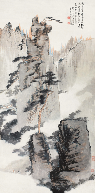 在20世纪的中国美术发展史上,张大千是一位极富人生传奇、享誉海峡两岸并在世界画坛深有影响的艺术大家。他精研传统,深攻笔墨,行路万里,阅历宽阔,1950年代以后先后旅居巴西、美国等地,更是广泛交游,打开视野,拓展了艺术的道路。他的水墨作品有山水、人物、花鸟多种面貌,尤以山水成就极高,他独创的泼墨与泼彩风格显示了他融传统与现代、笔墨韵味与形式语言等特点于一体的绘画观念,成为20世纪山水画变革之路上成功探索的典范。