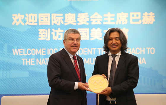 吴为山馆长向巴赫主席一行介绍了中国美术馆的典藏、展览等方面的情况。他说道,中国美术馆藏有十多万件美术作品,其中有很多是表现体育题材的,如表现女排精神的中国画作品《决战之前》,表现残疾运动员自强不息的雕塑作品《挑战》等。我们准备在冬奥会、残奥会的时候,把这些作品策划展示出来。同时组织全国优秀的美术家,创作关于奥运题材的美术作品,展现人文大同的体育精神。不仅如此,未来中国美术馆还将有计划地通过展览、出版、传播、教育、衍生品开发等途径,促进当代美术与体育的结合和创造。这不仅是对奥林匹克精神的弘扬,也是让多元文明的世界更加了解中国艺术、中国精神的契机。吴为山馆长说:“我们要把美的创造与奥林匹克精神融汇,为世界文明创造新的文化财富。”