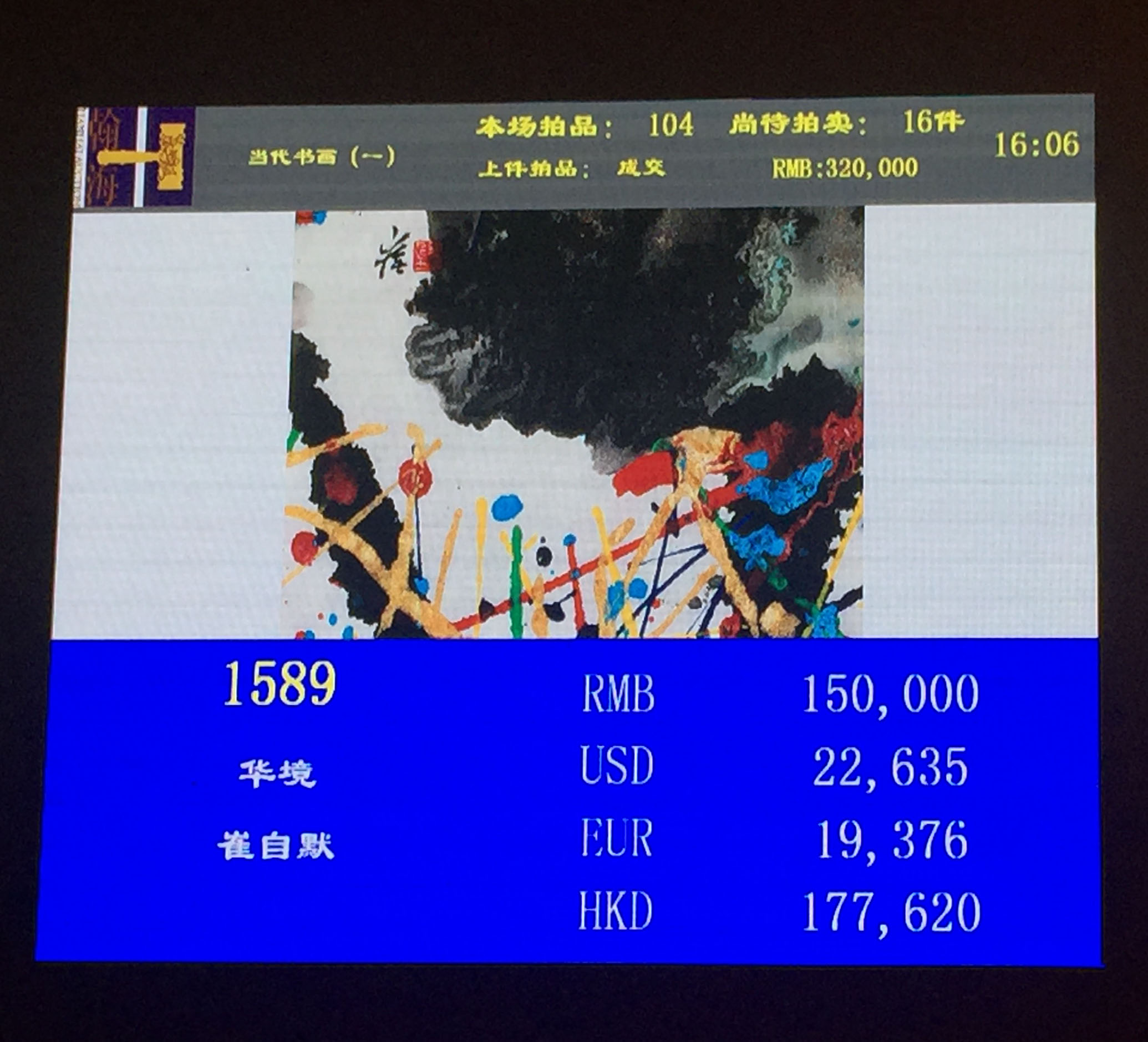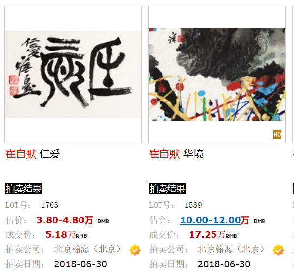 2018年6月30日,在“北京翰海2018春季拍卖会•中国当代书画(一)”专场中,国防大学美术书法研究院院长崔自默博士新彩作品《华境》,尺寸10.5cmx16cm,约0.2平尺,经过多轮竞拍,最终以17.25万元人民币成交(折合86.25万元/平尺)。