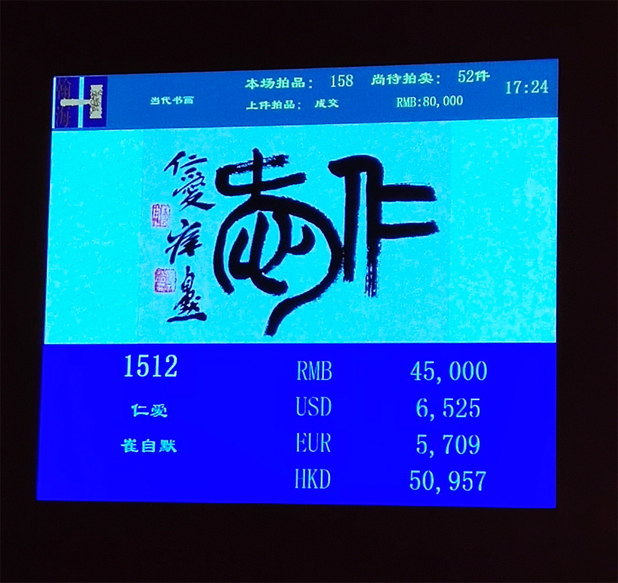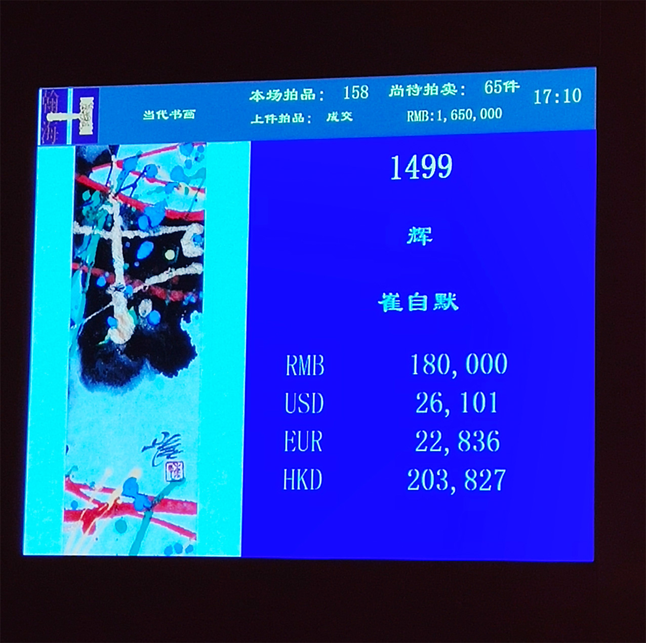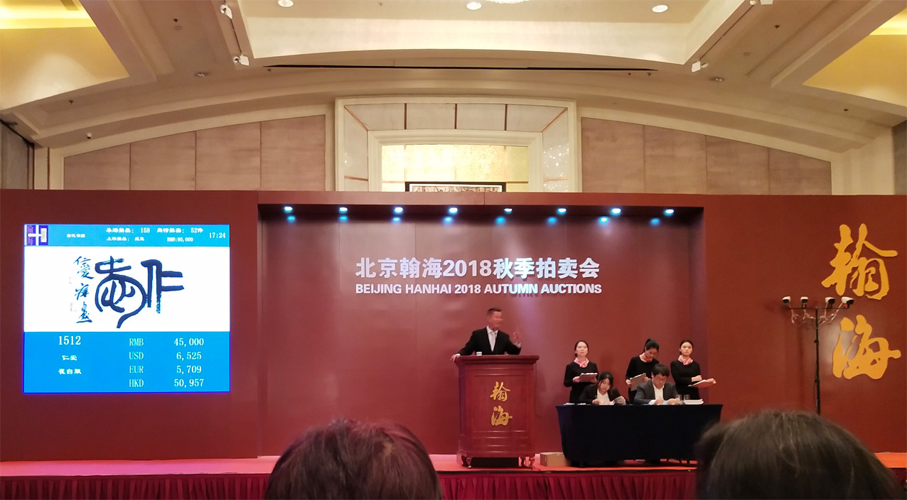 【A】 2018年12月8日,“北京翰海2018秋季拍卖会•中国当代书画”专场,崔自默新彩作品《Holy Way》尺寸23x8.5cm(约0.2平尺),经过多轮竞拍最终以20.7万元人民币成交(折合103.5万元/平尺)。 【B】 2018年12月8日,“北京翰海2018秋季拍卖会•中国当代书画”专场,崔自默书法作品《仁爱》(11x17cm,约0.2平尺),最终以5.2万元人民币成交(折合26万元/平尺)。