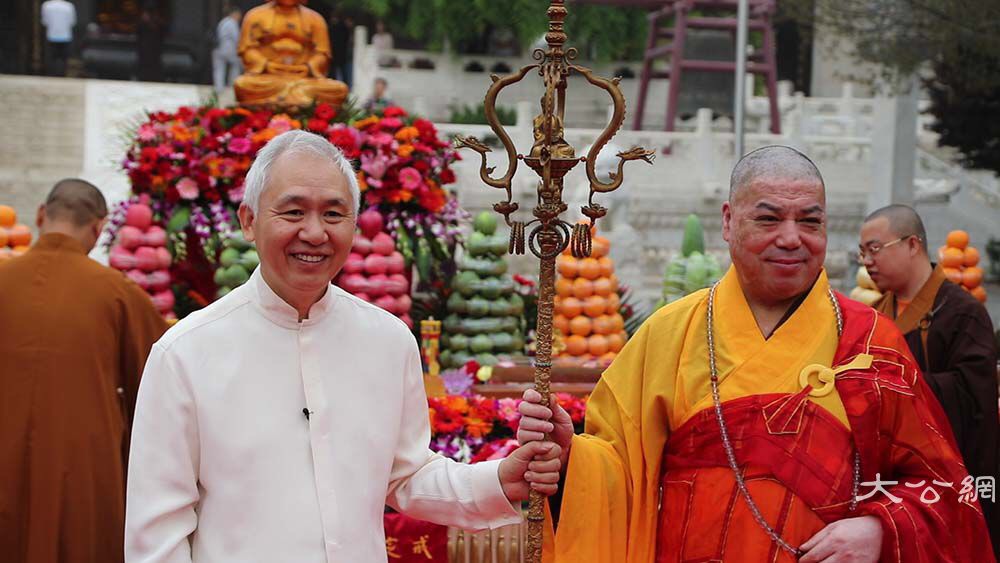 西安千年古刹大慈恩寺,在大雁塔前,浴佛节上,隆重举行了北京坦博艺苑创始人、中国书画协会名誉主席白十源先生捐赠佛教圣物的法会。收藏家白十源先生将他多年前从古印度犍陀罗地区收藏到的一枚佛骨舍利和从印缅收集到的八份贝叶经捐赠给大慈恩寺,把他最珍视的一件法器——四龙护佛十二环金锡杖奉赠给增勤大和尚,以供民众瞻仰、祈福。现场有数千信众共同见证了这千年一遇的历史时刻。
