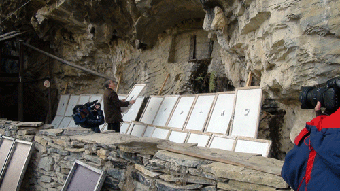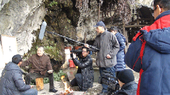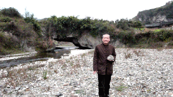 崔自默在石桥“默壁”岩下接受凤凰卫视等媒体现场采访