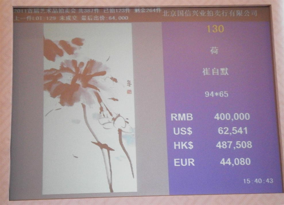 2011年8月19日下午13:30,北京国信兴业拍卖会首届当代艺术品拍卖会在中国大饭店一层会议大厅开拍。本次拍卖会共有300多件当代艺术品参拍,范曾、白雪石、杨晓阳、崔自默博士等当代名家的作品均以高价成交。其中著名画家崔自默博士五幅参拍作品以5800万元人民币的总成交额技惊四座,成为本次拍卖的最大的亮点。