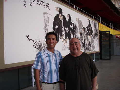 中国书画协会秘书长韩健与李嘉存先生在鸟巢画展其巨幅作品《雄英图》前