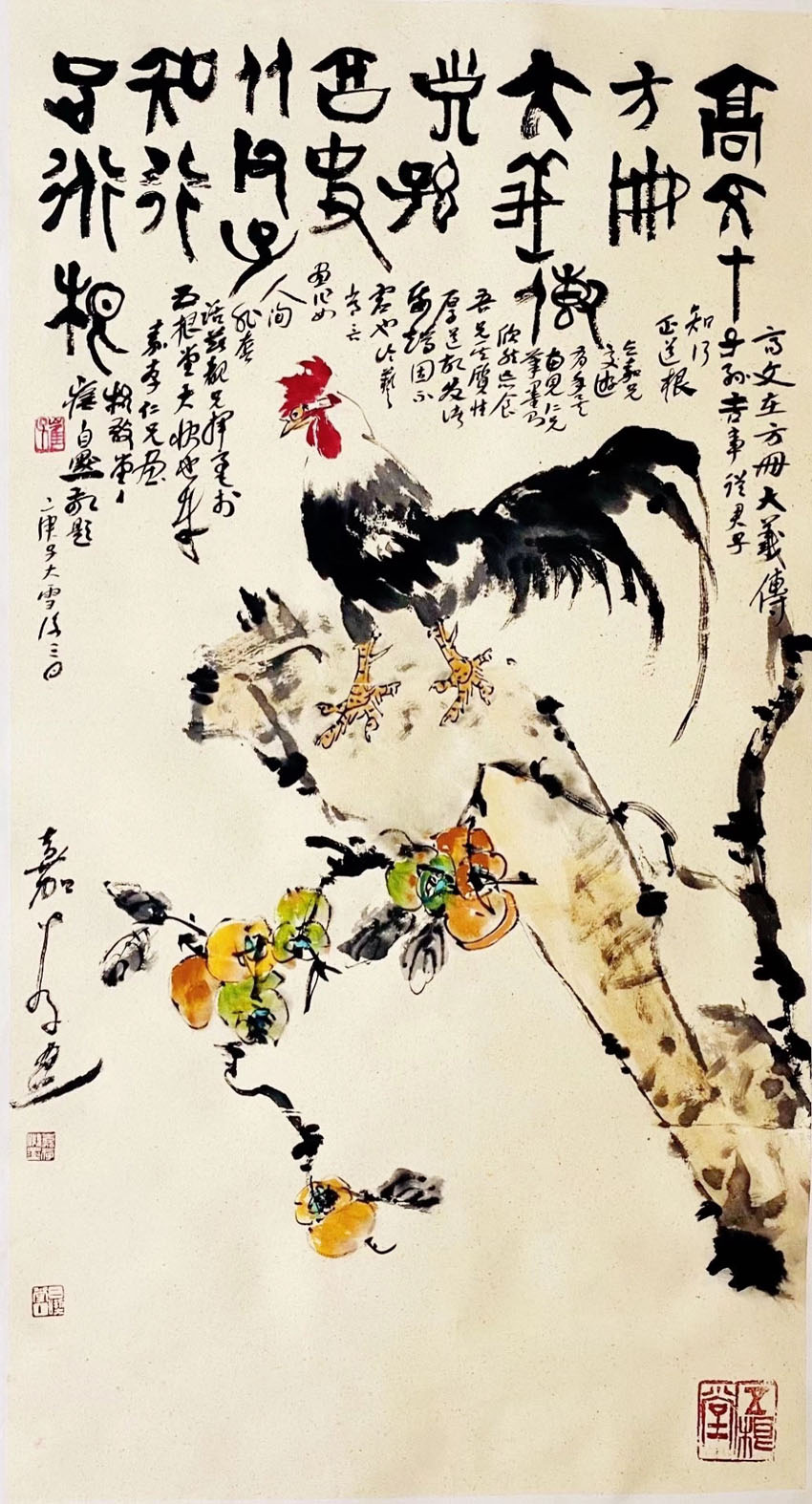 中国书画协会崔自默主席与影视演员画家李嘉存合作大鸡图,嘉存老师画,崔自默先生题“高文在方册,大义传子孙,吉事从君子,知行正道根。”