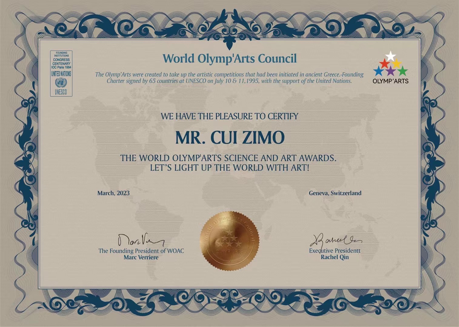 崔自默先生荣获国际奥艺“科学与艺术大奖”